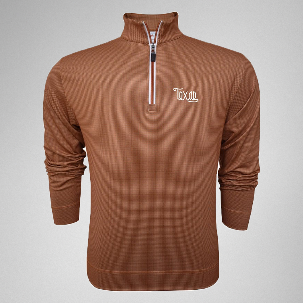Step into sophistication with the Script Texas Burnt Orange Shepherd Prestige Zip Pullover. Featuring a tailored fit, subtle grid texture, and the iconic Script Texas logo embroidered in white, this long sleeve quarter-zip delivers comfort, performance, and unmistakable style.