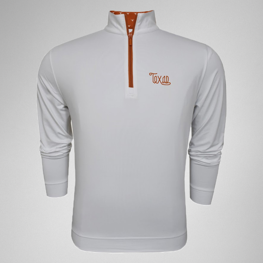 Keep it sleek and spirited with the Script Texas White Micro Fleece Performance Pullover. This long sleeve quarter-zip combines a crisp white outer layer with bold burnt orange details, including a contrast zip and embroidered Script Texas logo on the chest.