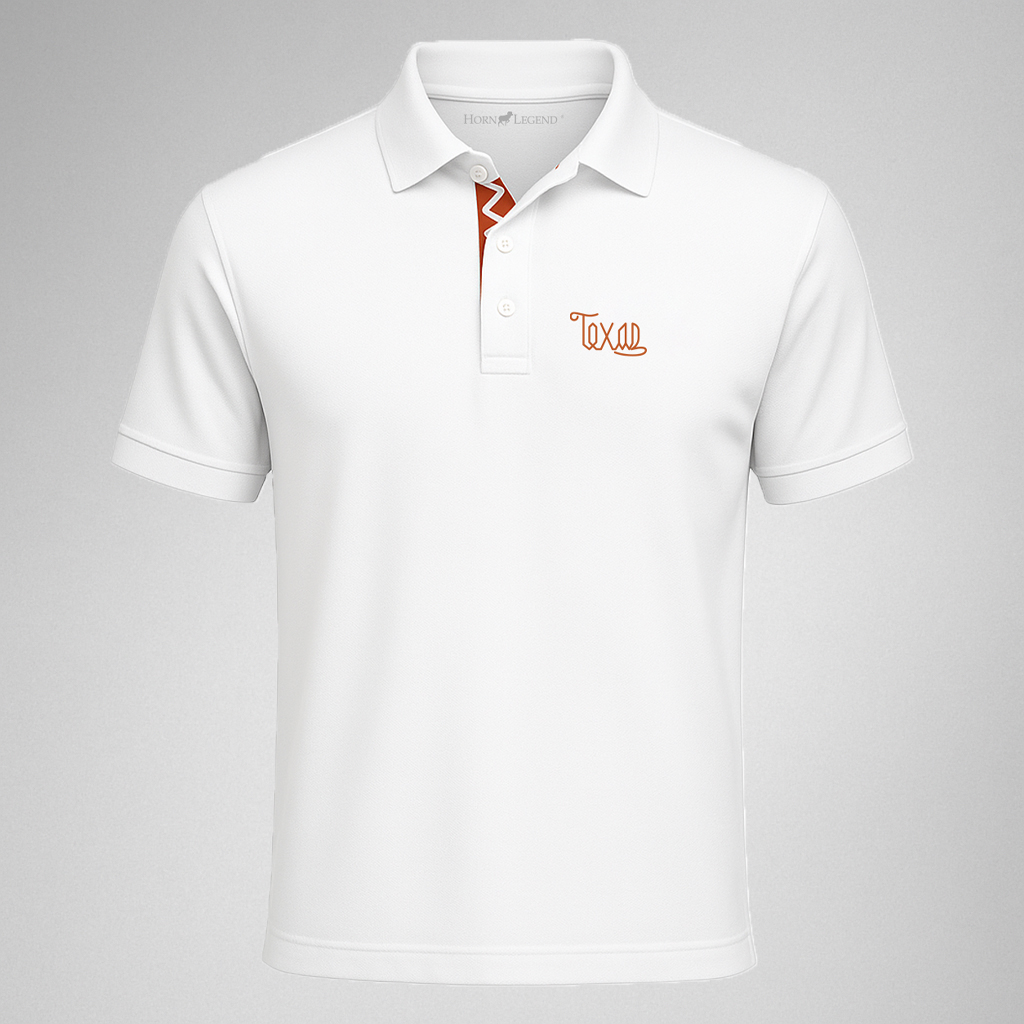 The Script Texas White Polo with LHB Custom Trim is a fresh take on timeless game day style. Made from a performance blend of bamboo charcoal polyester and spandex, it delivers lightweight stretch, moisture-wicking comfort, and UPF 50+ protection. The clean white body contrasts boldly with a burnt orange “Texas” script on the chest and a signature Longhorn Band–inspired inner placket. It’s a polished, breathable look that transitions easily from stadium seats to social events.